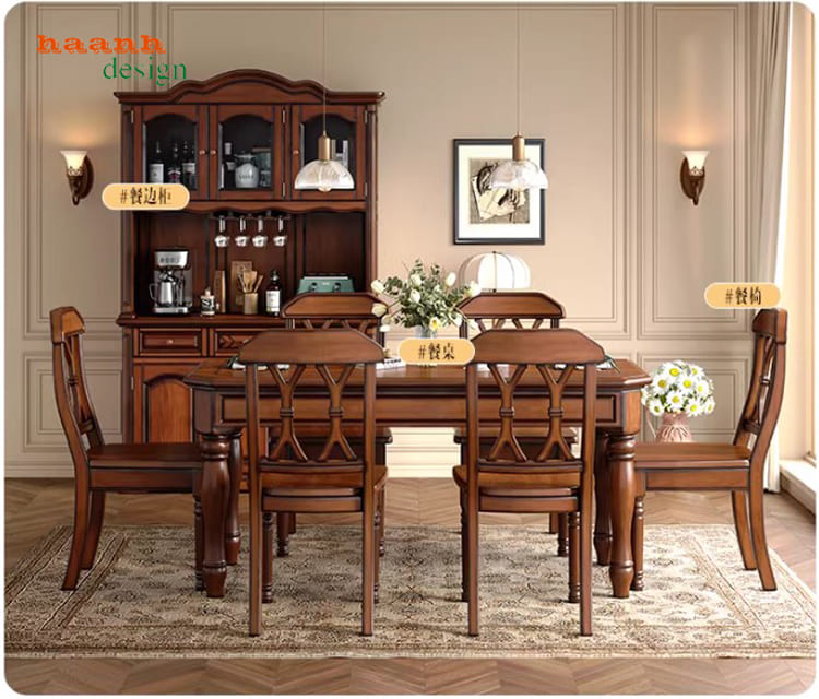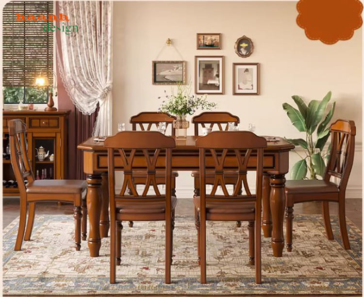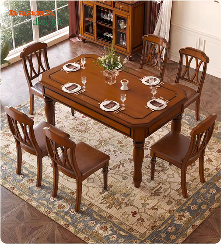 Bàn ăn gỗ tân cổ điển sử dụng gỗ sồi tự nhiên nhập khẩu từ Nga – một trong những loại gỗ được ưa chuộng nhất hiện nay.