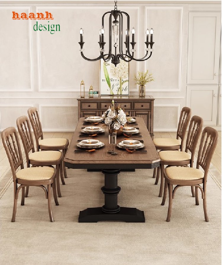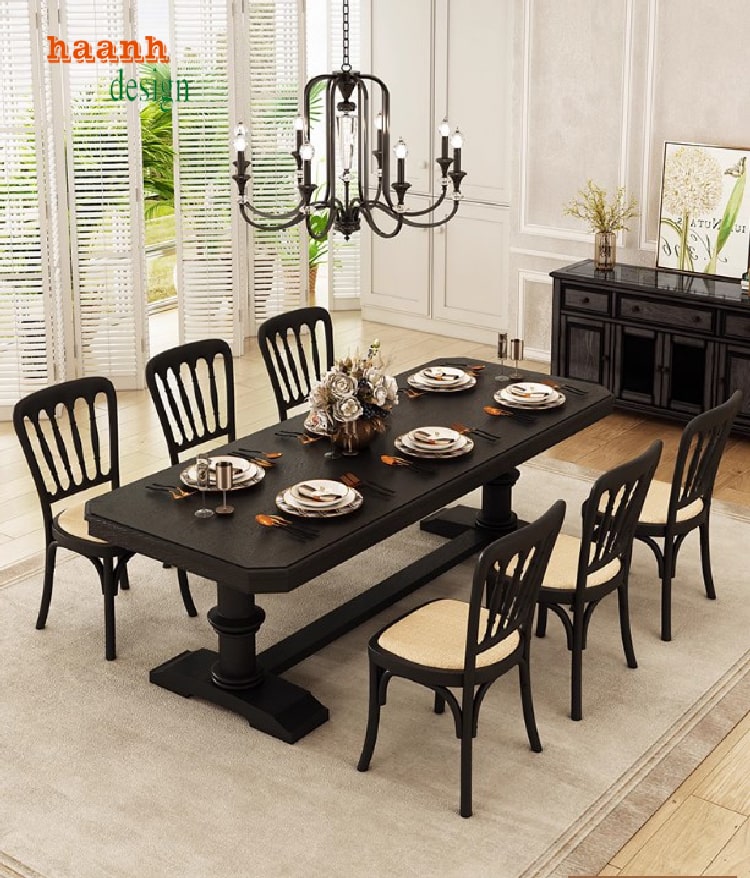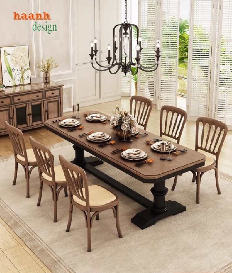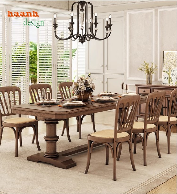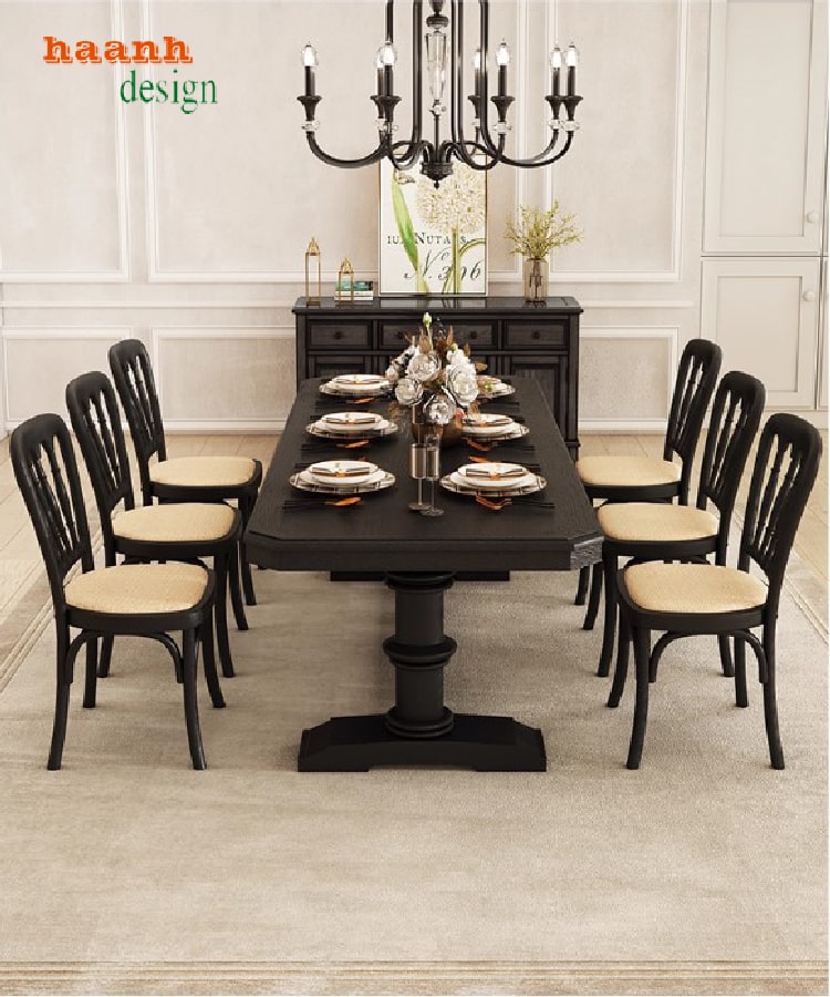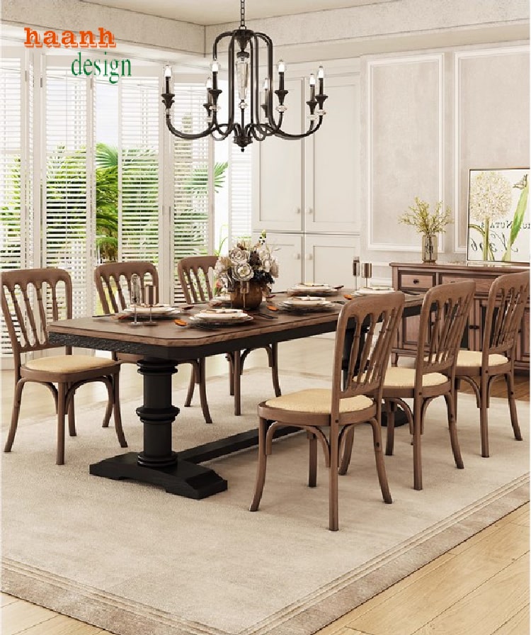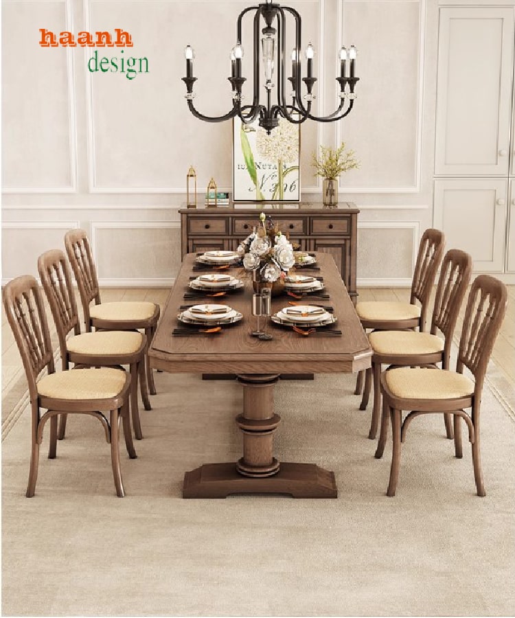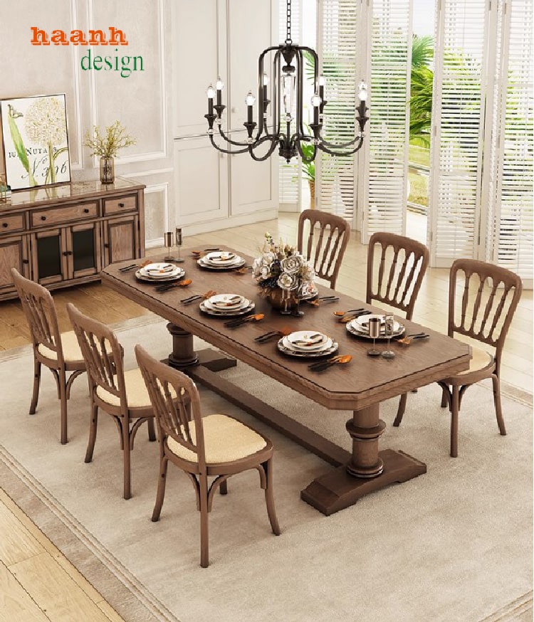 Bộ bàn ăn phong cách châu Âu được thiết kế đa dạng kích thước, phù hợp cho 4, 6 hoặc 8 người ngồi, mặt bàn hình chữ nhật hoặc oval. Ghế ngồi có đệm bọc nệm simili hoặc vải cao cấp, mang lại cảm giác êm ái khi sử dụng lâu dài.