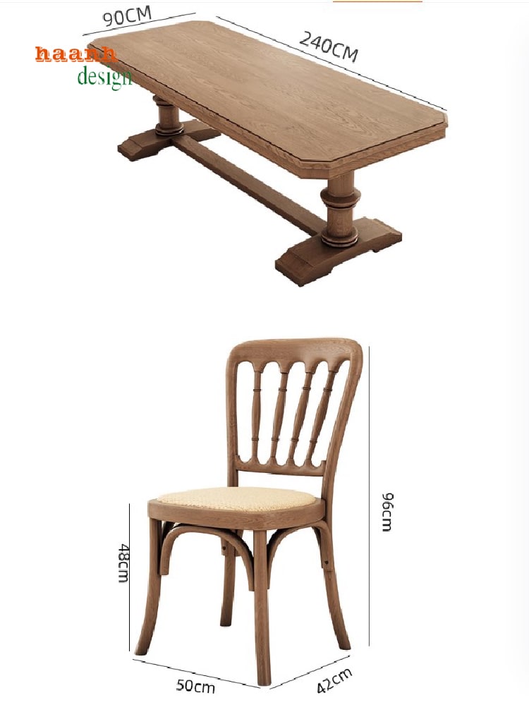 Bàn ghế ăn phong cách châu Âu được chế tác từ gỗ sồi tự nhiên nhập khẩu từ Nga, xử lý công nghệ hiện đại, phủ sơn Inchem 7 lớp cao cấp của Mỹ, mang đến vẻ đẹp sang trọng, bền bỉ theo thời gian. Thiết kế tinh tế theo phong cách Pháp cổ điển, phù hợp với nhiều không gian sống đẳng cấp, là lựa chọn lý tưởng cho những ai yêu thích nội thất châu Âu chuẩn mực.