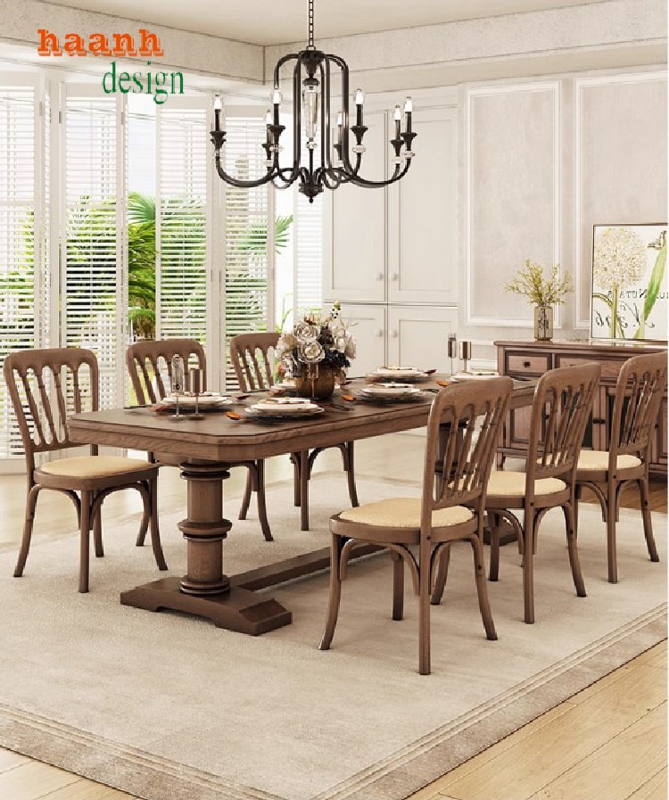 Bộ bàn ghế ăn phong cách châu Âu được lấy cảm hứng từ nghệ thuật kiến trúc Pháp cổ, nổi bật với những đường cong mềm mại, chân bàn và ghế được chạm trổ thủ công tỉ mỉ. Thiết kế tôn lên vẻ quý phái, thanh lịch, dễ dàng kết hợp với các không gian như phòng ăn biệt thự, nhà phố, căn hộ cao cấp hay khách sạn, resort sang trọng.