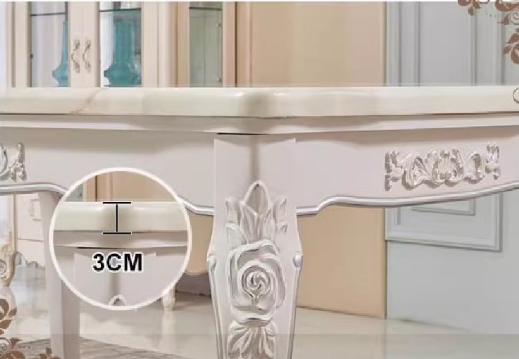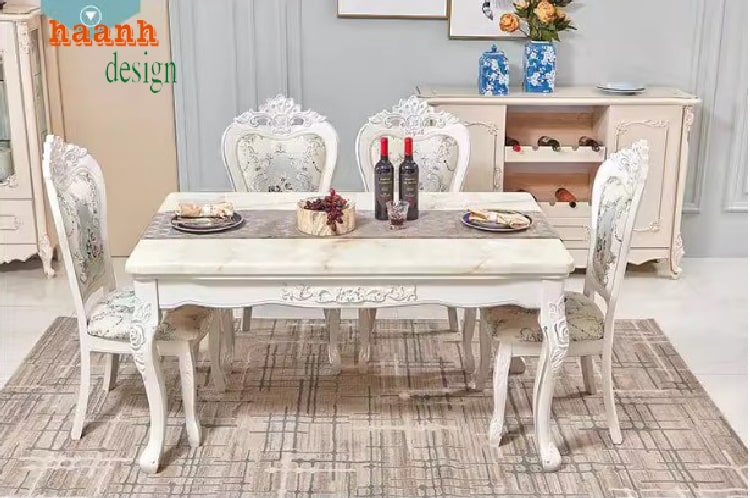 Thiết kế bàn ghế ăn tân cổ điển thường mang đậm dấu ấn của nghệ thuật Châu Âu, với những đường nét uốn lượn mềm mại và các chi tiết chạm khắc tinh xảo.