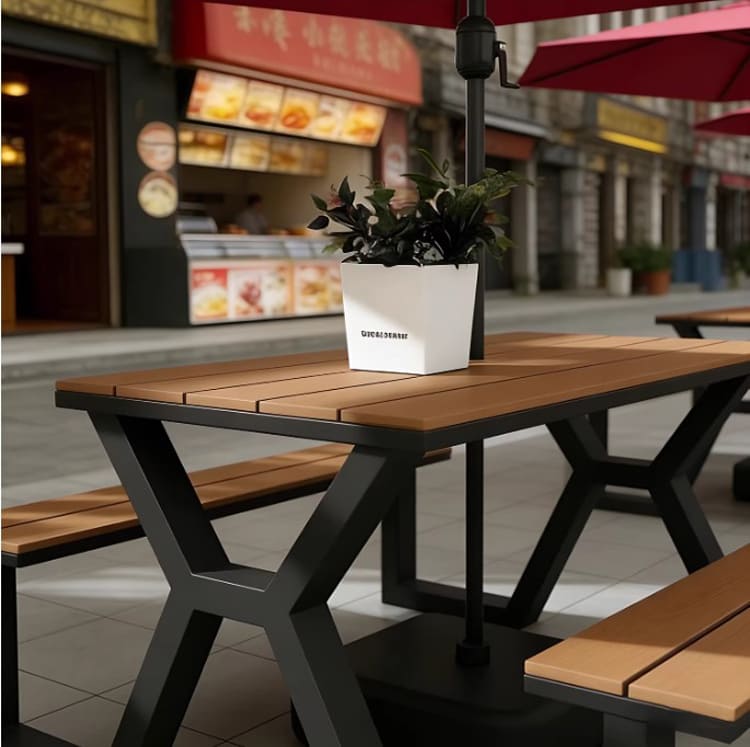 Khi kết hợp với khung sắt sơn tĩnh điện, bàn ghế chân sắt mặt gỗ trở thành sản phẩm có độ bền và tính thẩm mỹ cao, phù hợp cho mọi công trình ngoài trời.