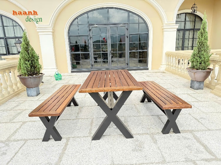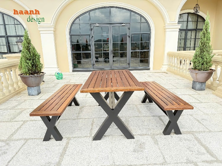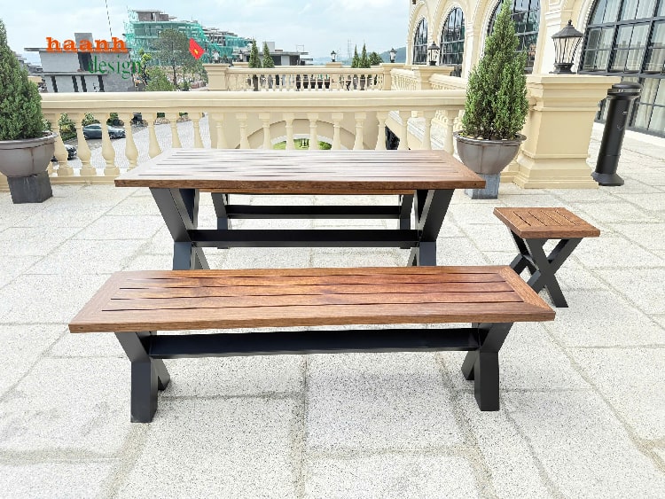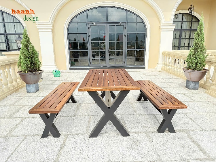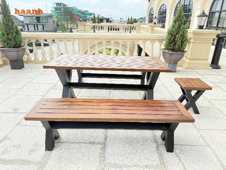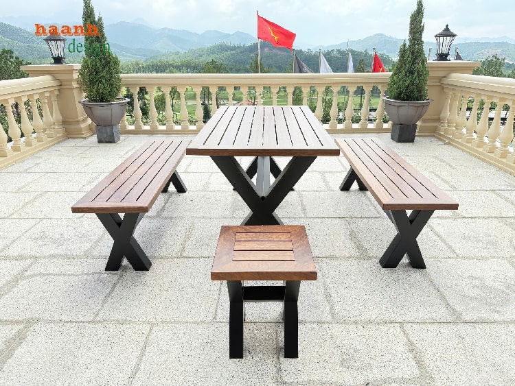 Bộ bàn ghế gỗ chân sắt được thiết kế với đường nét gọn gàng, hiện đại, dễ dàng phối với sân golf, resort, quán café hay sân vườn gia đình.