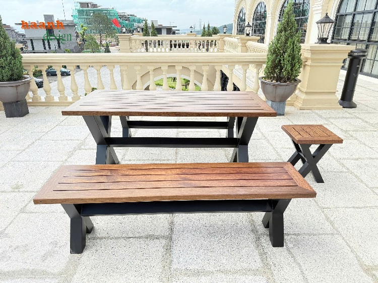 Bề mặt bàn và ghế được làm từ gỗ Teak tự nhiên – loại gỗ quý hiếm có khả năng chống chịu thời tiết, kháng nước và hạn chế cong vênh. Đây là yếu tố giúp bàn ghế sắt gỗ luôn giữ được sự bền đẹp khi sử dụng lâu dài.