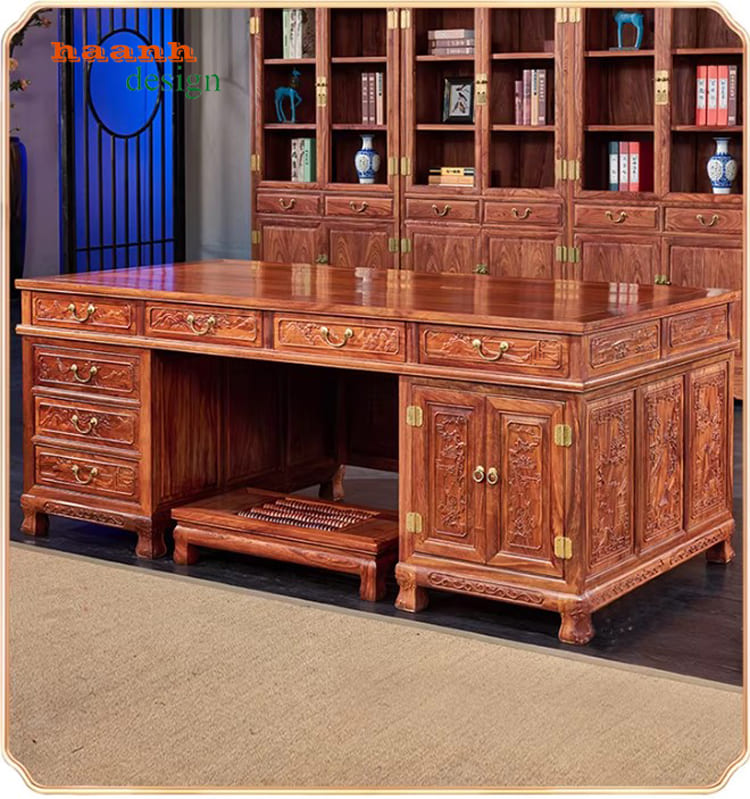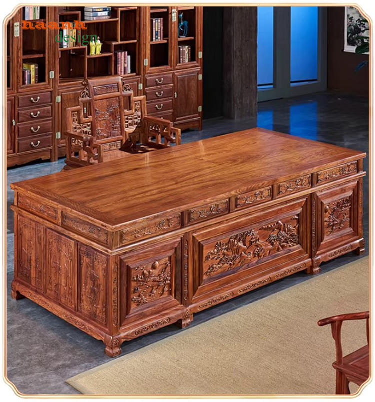 Bàn làm việc gỗ giả cổ Trung Quốc được chế tác từ gỗ hương Nam Phi cao cấp, sơn PU Inchem Mỹ và phụ kiện Hafele Đức. Thiết kế chạm khắc tinh xảo, kiểu dáng bề thế, phù hợp phòng giám đốc và không gian làm việc sang trọng. Sản phẩm bền đẹp 20–30 năm, nâng tầm đẳng cấp và phong thủy cho chủ nhân.