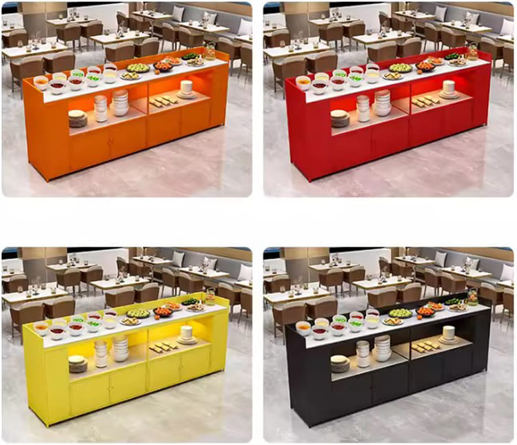 Bàn buffee gỗ công nghiệp tích hợp đèn LED sang trọng cho khách sạn, nhà hàng.