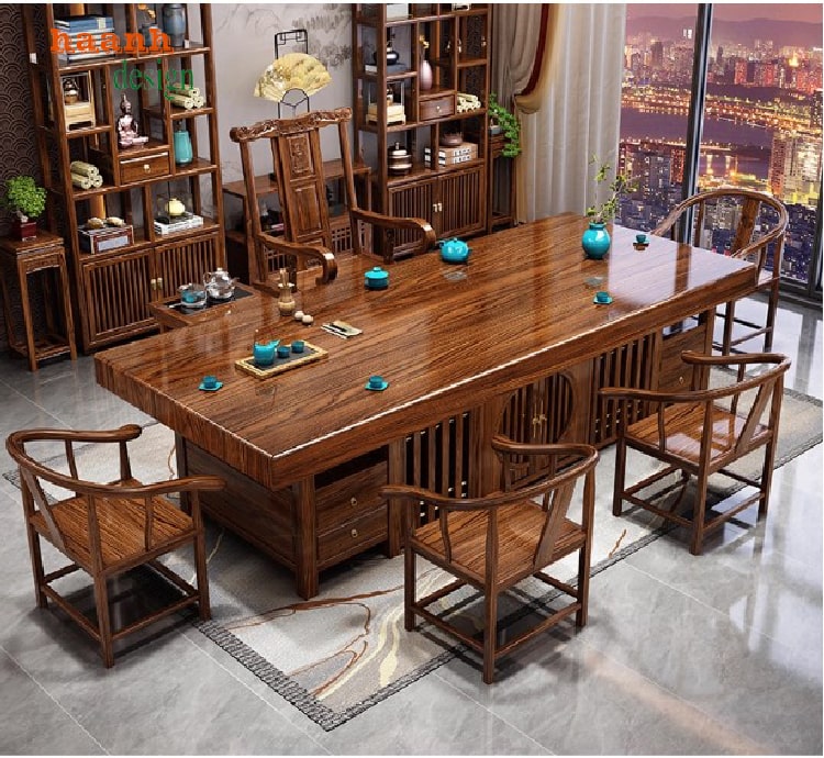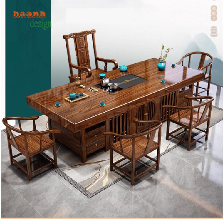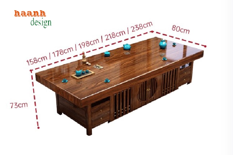 Bàn trà phòng khách được thiết kế theo phong cách nhà Minh Trung Quốc, sử dụng gỗ sồi tự nhiên nhập khẩu (sồi Nga, sồi Mỹ), mặt bàn gỗ liền khối, sơn hoàn thiện bằng sơn INCHEM cao cấp của Mỹ với màu giả gỗ hương hoặc gỗ óc chó. Sản phẩm mang vẻ đẹp cổ điển, sang trọng, phù hợp nhiều không gian sống và là lựa chọn lý tưởng cho phòng trà hiện đại.