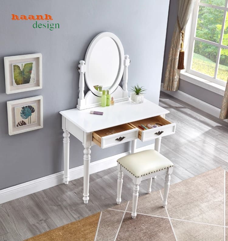 Không chỉ phục vụ nhu cầu trang điểm, chiếc bàn còn là điểm nhấn không gian, giúp phòng ngủ trở nên lộng lẫy và quý phái hơn.