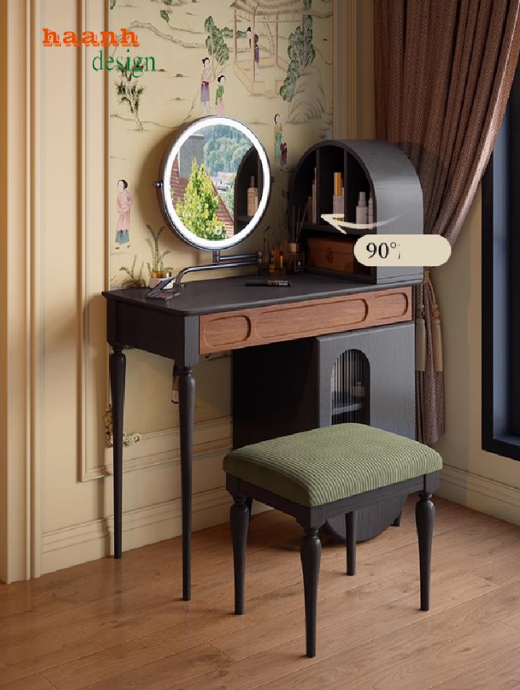 Khác biệt với những sản phẩm thông thường, mẫu bàn gỗ trang điểm này sử dụng sơn đen giữ vân, vừa bảo vệ bề mặt gỗ vừa tôn lên vẻ đẹp tự nhiên của từng đường vân. Đây là gam màu sang trọng, dễ phối hợp với nhiều phong cách nội thất khác nhau.