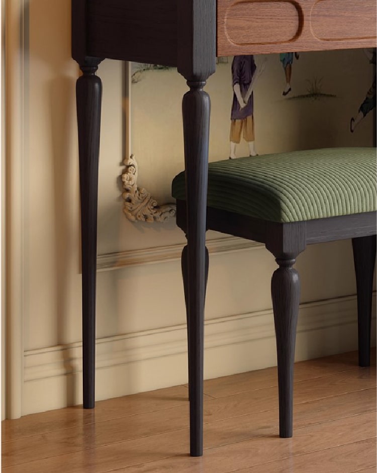 Mẫu bàn trang điểm gỗ sồi tự nhiên nhập khẩu Nga mang phong cách Pháp tân cổ điển sang trọng, kết hợp màu sơn đen giữ vân độc đáo. Sản phẩm sử dụng phụ kiện Hafele Đức cao cấp, thiết kế tinh tế, tiện ích vượt trội. Đây là lựa chọn hoàn hảo cho phòng ngủ đẳng cấp, vừa đẹp mắt vừa bền bỉ theo thời gian.