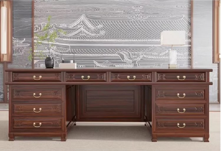 Nhiều mẫu bàn làm việc gỗ gụ được thiết kế với các tính năng tiện ích như ngăn kéo, tủ kệ, giúp tối ưu hóa không gian làm việc.