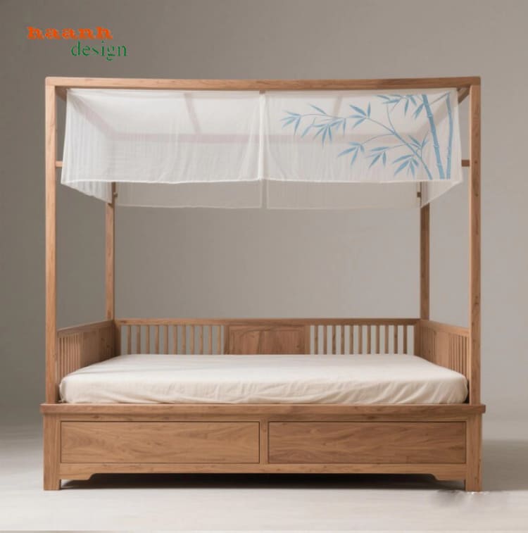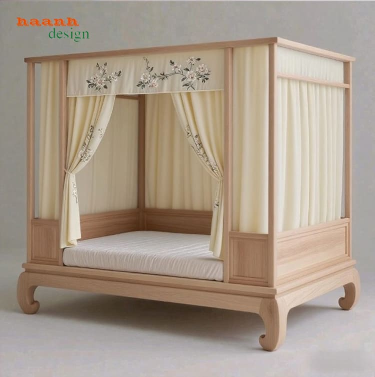 Lấy cảm hứng từ phong cách nội thất thời Tống, giường ngủ gỗ đời Tống nổi bật với thiết kế ba thành và bốn cột góc, tạo cảm giác vững chãi, kín đáo và rất phù hợp với triết lý phong thủy Á Đông.