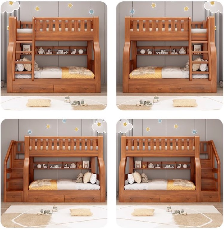 Chất liệu chính tạo nên các mẫu giường tầng cho bé là gỗ sồi tự nhiên đã qua xử lý chống cong vênh, mối mọt và co ngót hiệu quả. Kết hợp với đó là gỗ công nghiệp Flywood, nổi bật với độ bền cao, chịu lực tốt, giúp sản phẩm duy trì tuổi thọ lâu dài.
