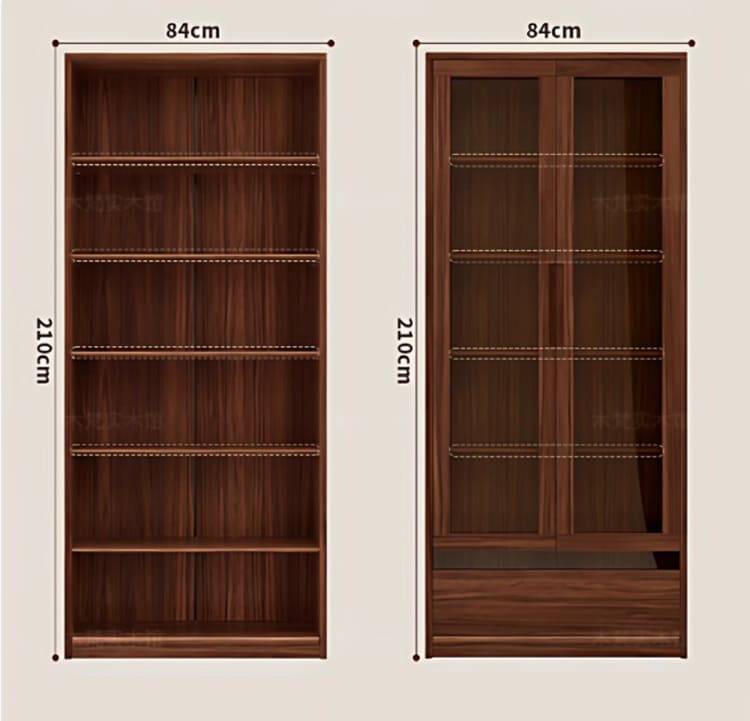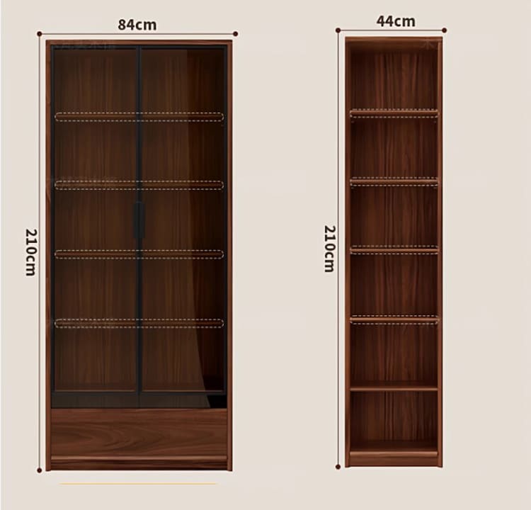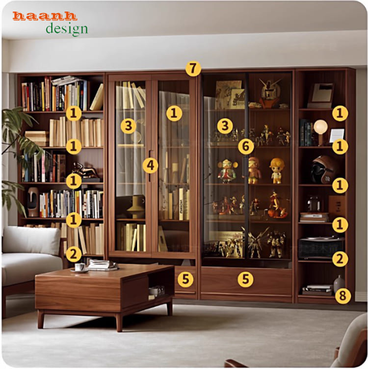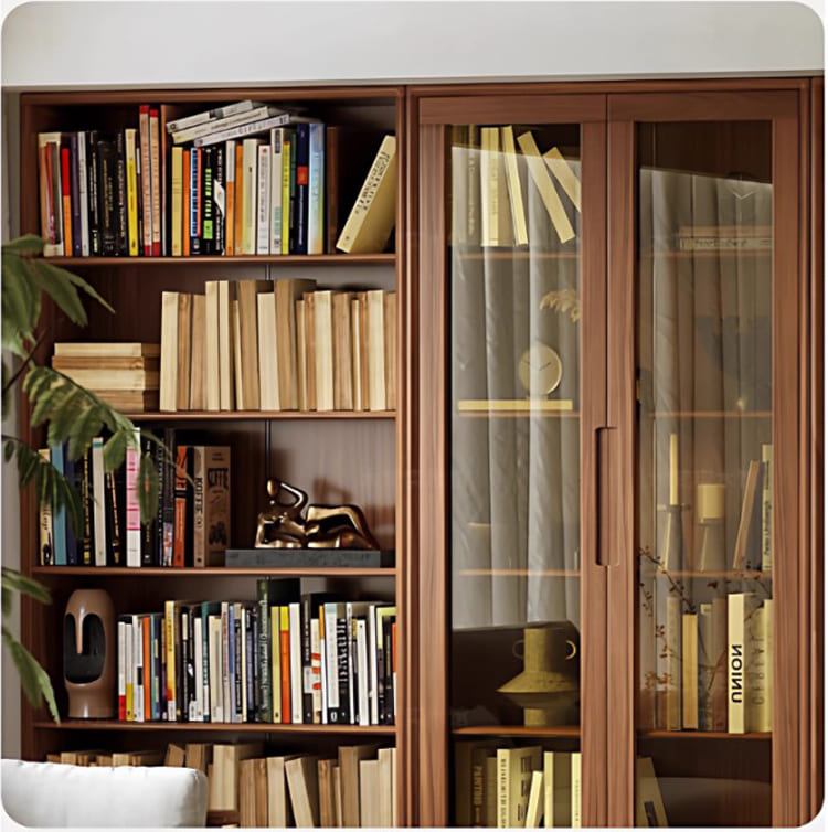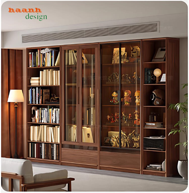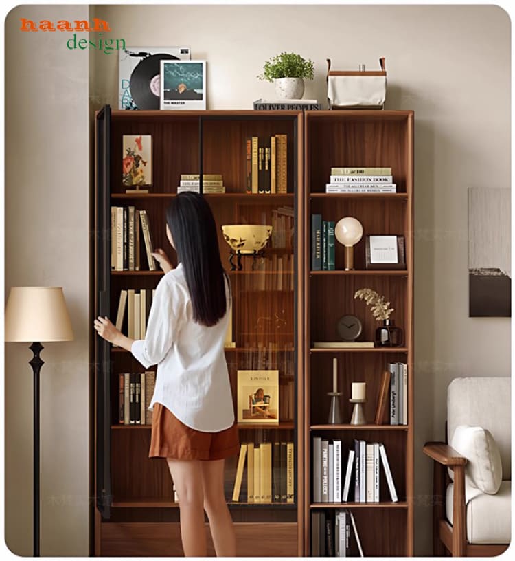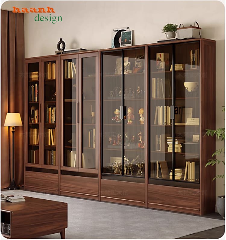 Cánh kính sang trọng kết hợp phụ kiện cao cấp trên kệ sách gỗ