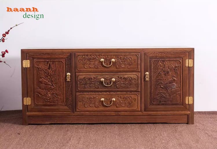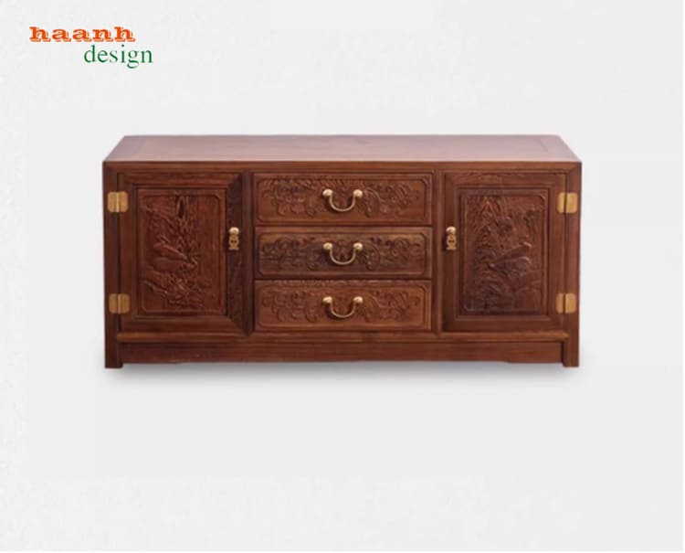 Điểm tạo nên giá trị nghệ thuật của kệ tivi bằng gỗ là hệ thống hoa văn được chạm tay: