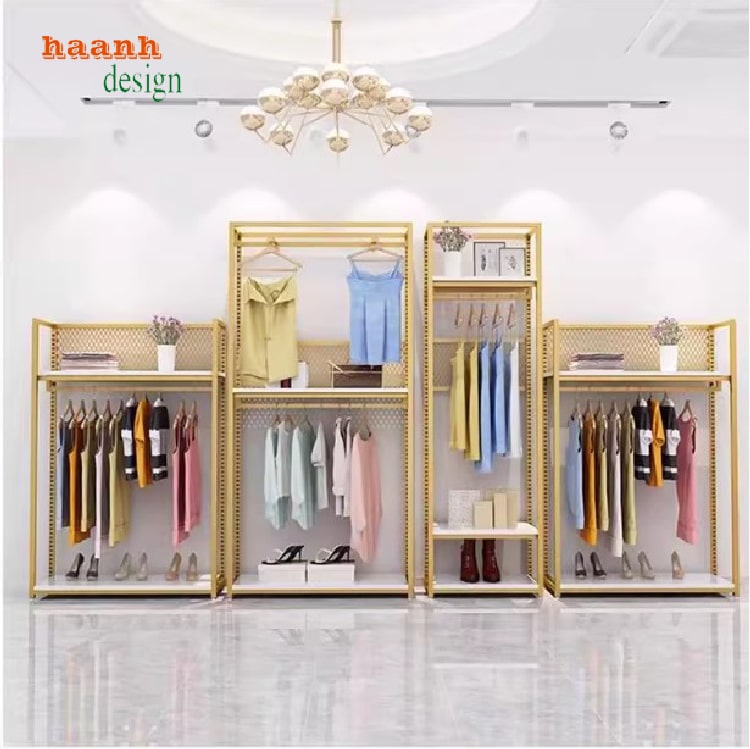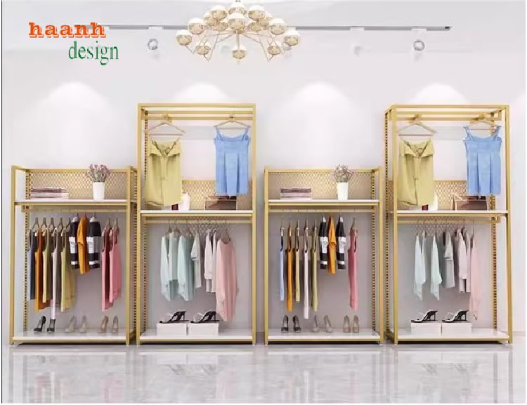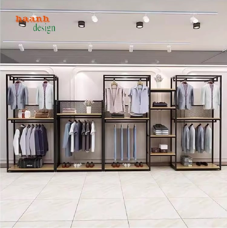 Kệ sắt shop quần áo không chỉ tiện lợi mà còn giúp tôn lên vẻ đẹp sản phẩm nhờ kiểu dáng mở, dễ dàng kết hợp trang trí ánh sáng, tạo điểm nhấn cho không gian trưng bày.