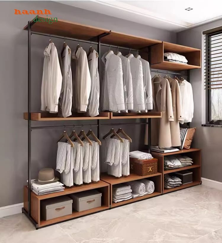 Kệ treo quần áo khung sắt có thể thiết kế theo nhiều kích thước khác nhau, phù hợp diện tích từng phòng. Có thể tích hợp: