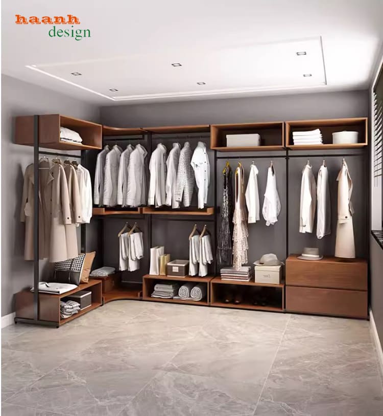 Thiết kế kết hợp gỗ công nghiệp chống ẩm nhập khẩu Thái Lan trong kệ treo quần áo bằng sắt.