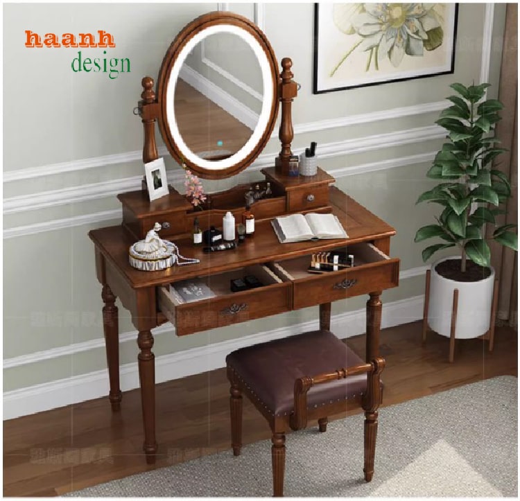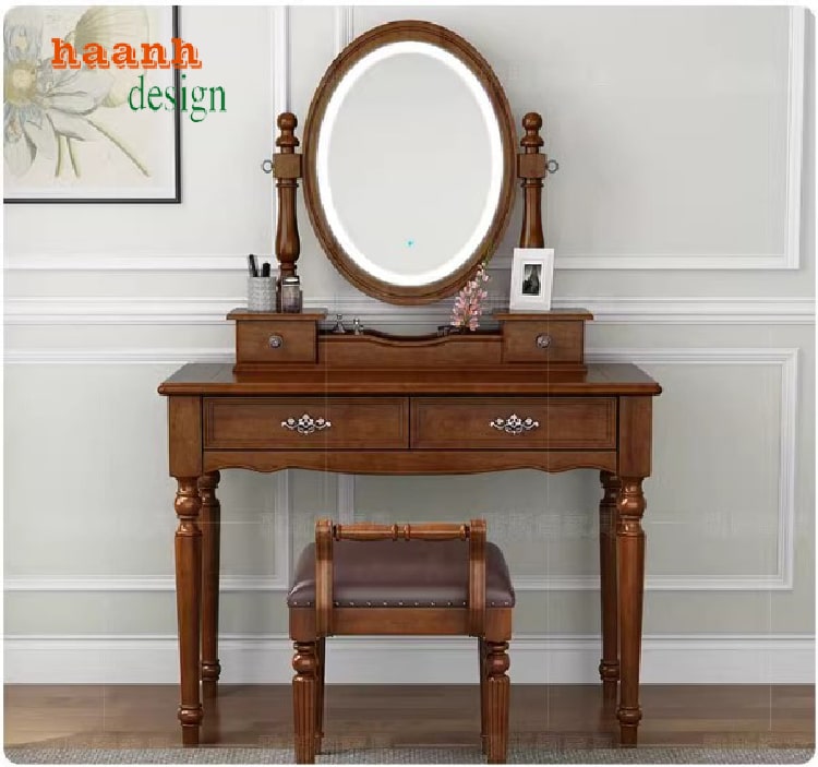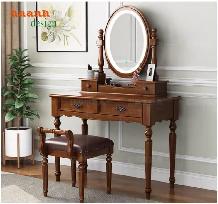 Bàn phấn cổ điển gỗ là một trong những mẫu bàn được ưa chuộng nhất, không chỉ vì độ bền mà còn vì vẻ đẹp tự nhiên mà nó mang lại. Gỗ tự nhiên không chỉ mang lại cảm giác gần gũi mà còn thể hiện được đẳng cấp và phong cách của người dùng.