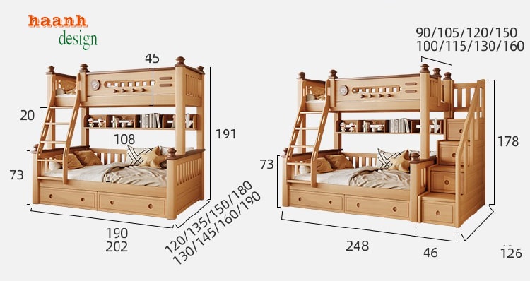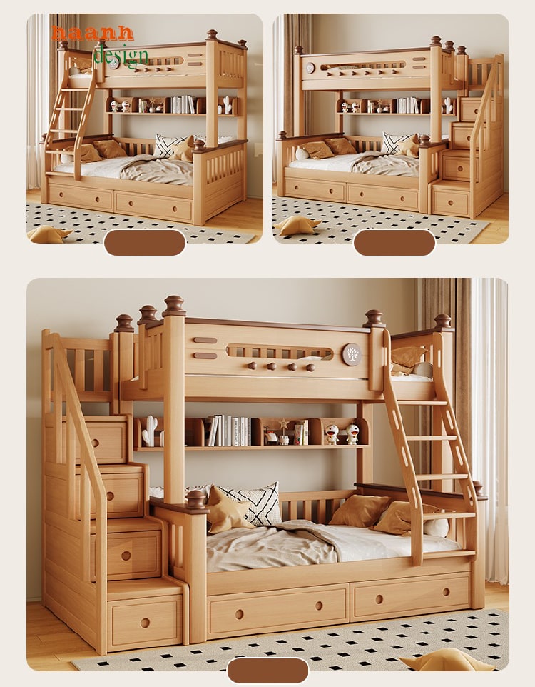 Giường tầng trẻ em gỗ tự nhiên có đa dạng về kiểu dáng và màu sắc. Từ những thiết kế đơn giản, thanh lịch đến những mẫu giường cầu kỳ, tinh tế, tất cả đều có thể đáp ứng nhu cầu thẩm mỹ của từng gia đình.