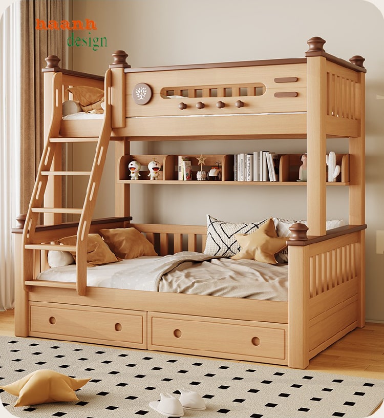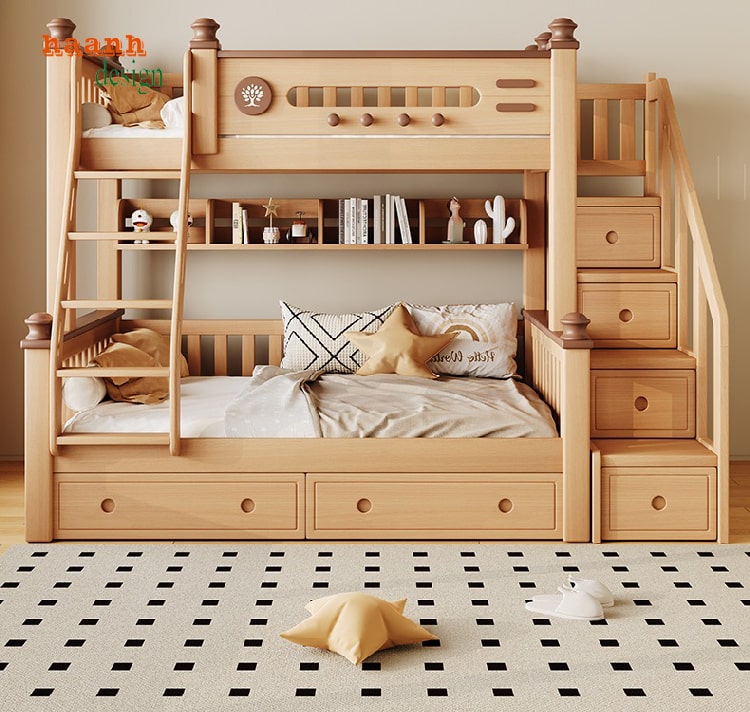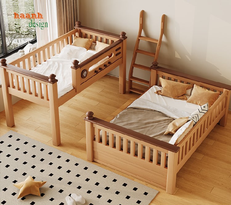 Giường tầng gỗ tự nhiên luôn chiếm ưu thế trong lòng nhiều bậc phụ huynh bởi vẻ đẹp sang trọng và độ bền cao. Gỗ tự nhiên không chỉ dễ dàng phối hợp với nhiều phong cách nội thất mà còn an toàn cho sức khỏe của trẻ nhỏ.