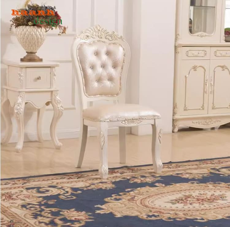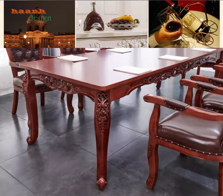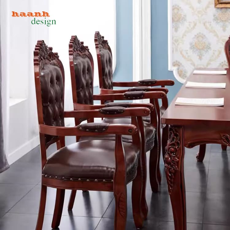 Mẫu bàn ăn cổ điển đẹp được sản xuất từ gỗ sồi và gỗ xoan đào tự nhiên nhập khẩu, thiết kế theo phong cách tân cổ điển châu Âu sang trọng, đục chạm hoa lá tinh xảo, bọc đệm vải cao cấp. Sản phẩm phù hợp sử dụng trong nhà hàng, khách sạn, biệt thự, mang đến không gian đẳng cấp và bền đẹp lâu dài.