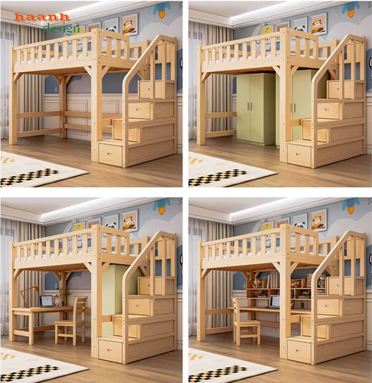 Mẫu giường gỗ cho bé đẹp tích hợp bàn học và tủ áo tiện ích.