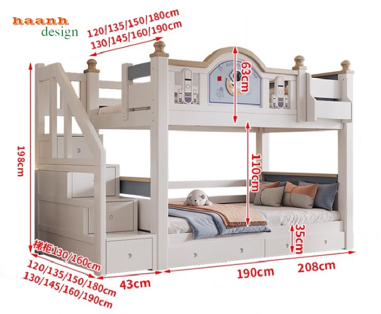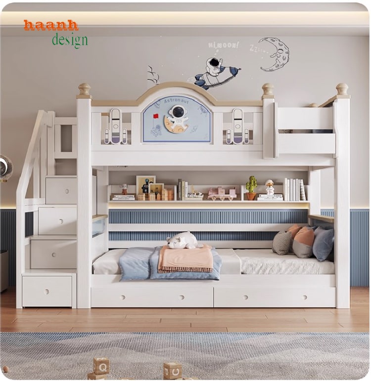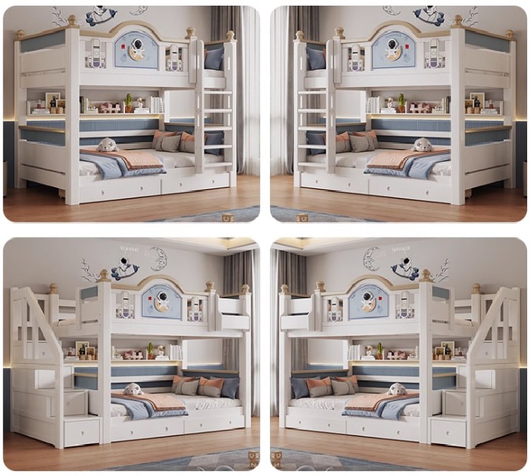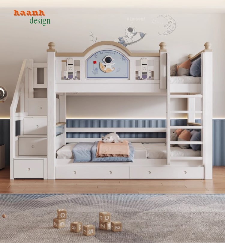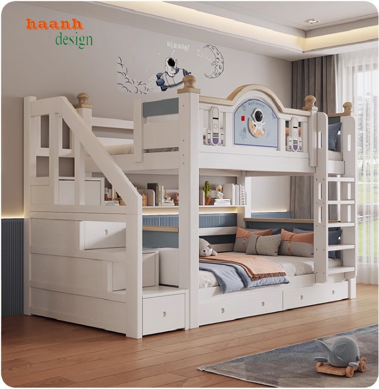 Thay vì kiểu thang gắn trực tiếp, giường được thiết kế cầu thang bên cạnh, dễ dàng lên xuống và an toàn hơn cho trẻ nhỏ. Đây là chi tiết quan trọng giúp các bậc phụ huynh yên tâm khi lựa chọn giường ngủ 2 tầng cho bé trai hay bé gái.
