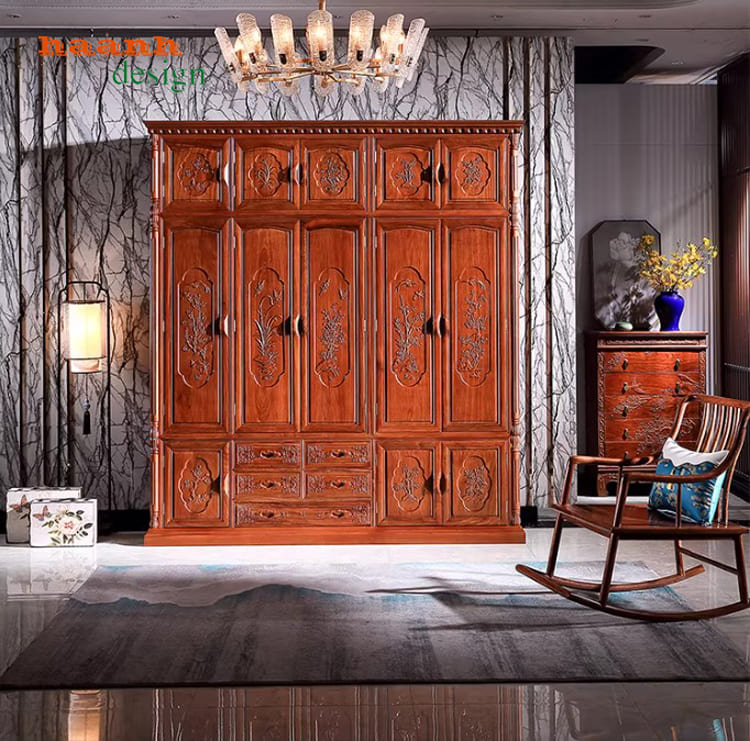 Hoa văn chạm khắc CNC trên tủ quần áo gỗ hương