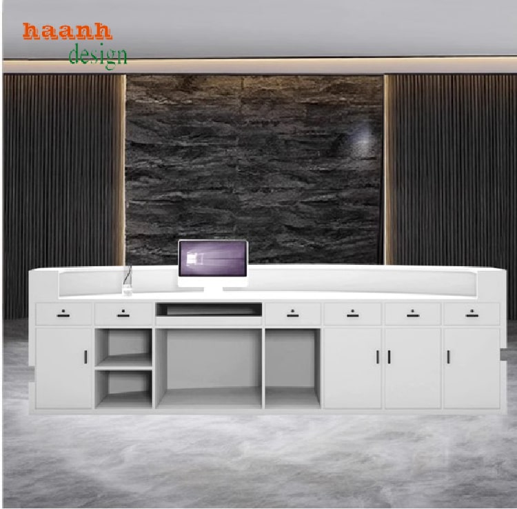 Chúng tôi nhận thiết kế và sản xuất quầy lễ tân theo yêu cầu, phối màu, kích thước và bố cục theo bộ nhận diện riêng của từng doanh nghiệp.
