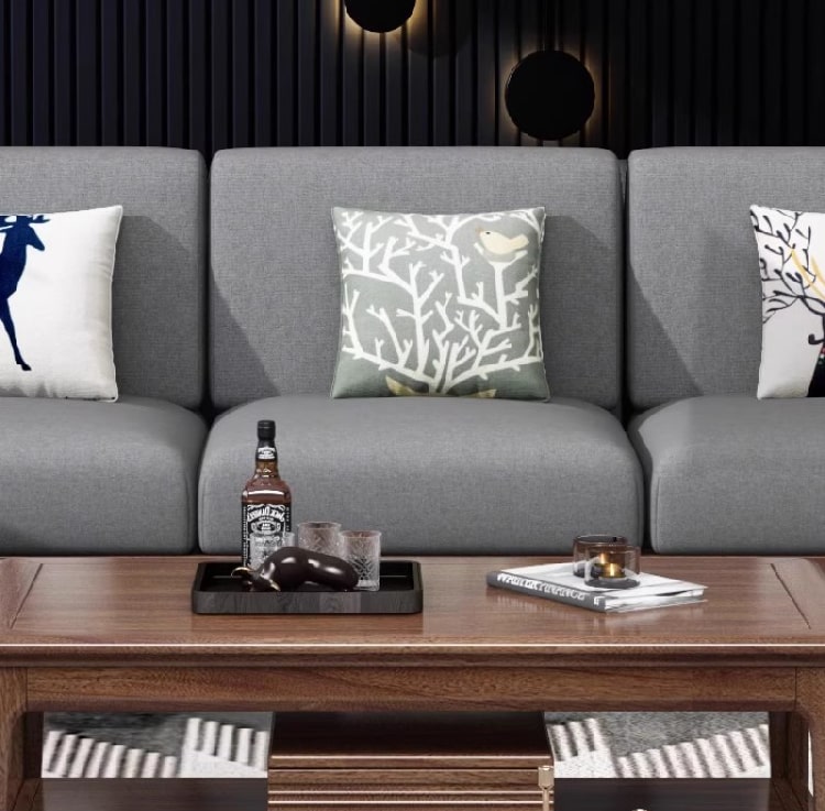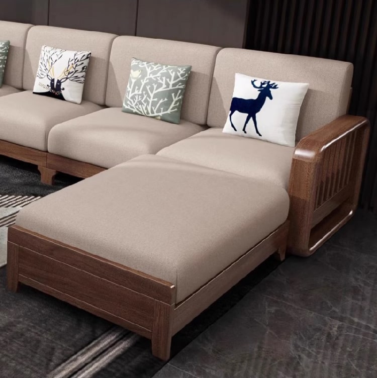 Không chỉ đầu tư vào phần khung gỗ, phần đệm cũng là một điểm cộng lớn của sofa phòng khách gỗ. Sản phẩm sử dụng vải bọc Hàn Quốc cao cấp với khả năng chống thấm nhẹ, dễ lau chùi, màu sắc trang nhã và độ bền cao. Lõi đệm là mút liên doanh Việt Nhật, đem lại cảm giác êm ái, đàn hồi tốt và không bị xẹp lún sau thời gian dài sử dụng.
