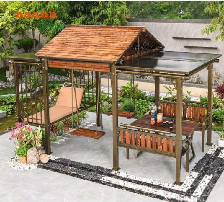 Ngoài ra, chòi nghỉ bằng sắt còn được thiết kế với nhiều kiểu dáng khác nhau, từ cổ điển đến hiện đại. Điều này giúp cho việc lựa chọn chòi nghỉ phù hợp với không gian sân vườn của từng gia đình trở nên dễ dàng hơn. Kiểu dáng độc đáo không chỉ tạo nên điểm nhấn cho không gian mà còn thể hiện gu thẩm mỹ của chủ nhân.