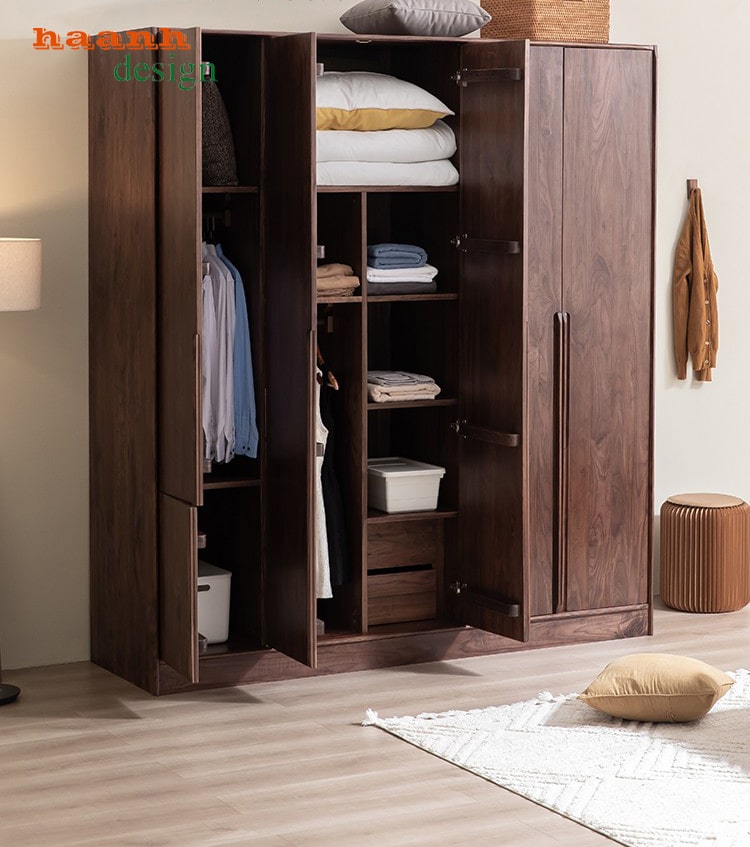 Tủ áo gỗ công nghiệp óc chó thường được thiết kế với nhiều ngăn kéo, khoang treo quần áo và kệ để giày dép, giúp sắp xếp đồ dùng cá nhân của gia đình một cách gọn gàng và tiện lợi. Mặt tủ thường được phủ lớp sơn phủ chống trầy, chống mối mọt và chống ẩm, giúp bảo vệ tủ áo khỏi các tác động từ môi trường bên ngoài.
