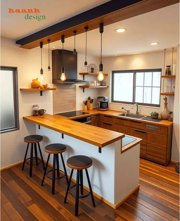 Mẫu **bếp gỗ công nghiệp** thiết kế chữ L