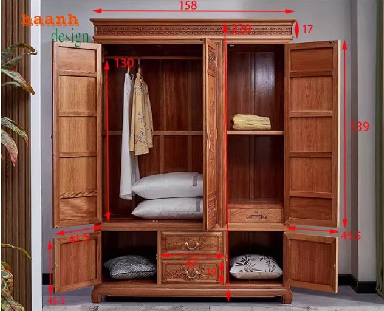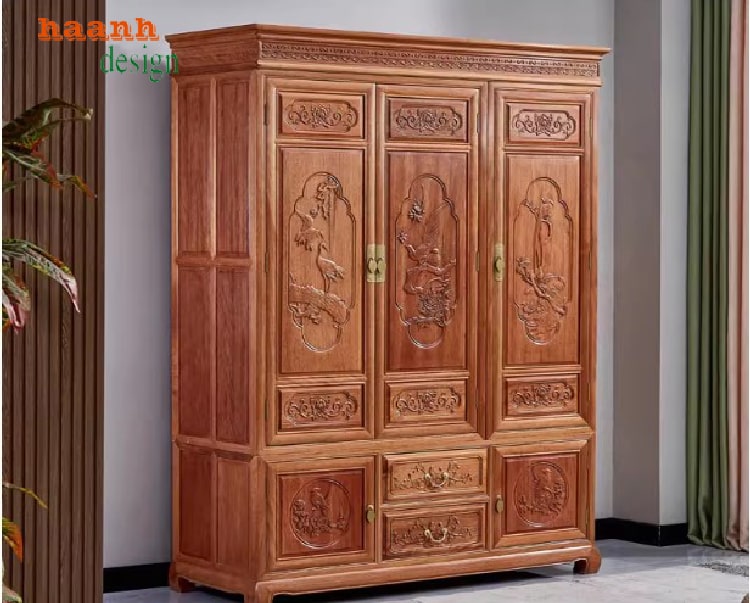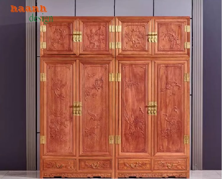 Mẫu tủ đựng quần áo bằng gỗ tự nhiên với thiết kế tinh tế, đường nét chạm khắc mang đậm văn hóa phương Đông.