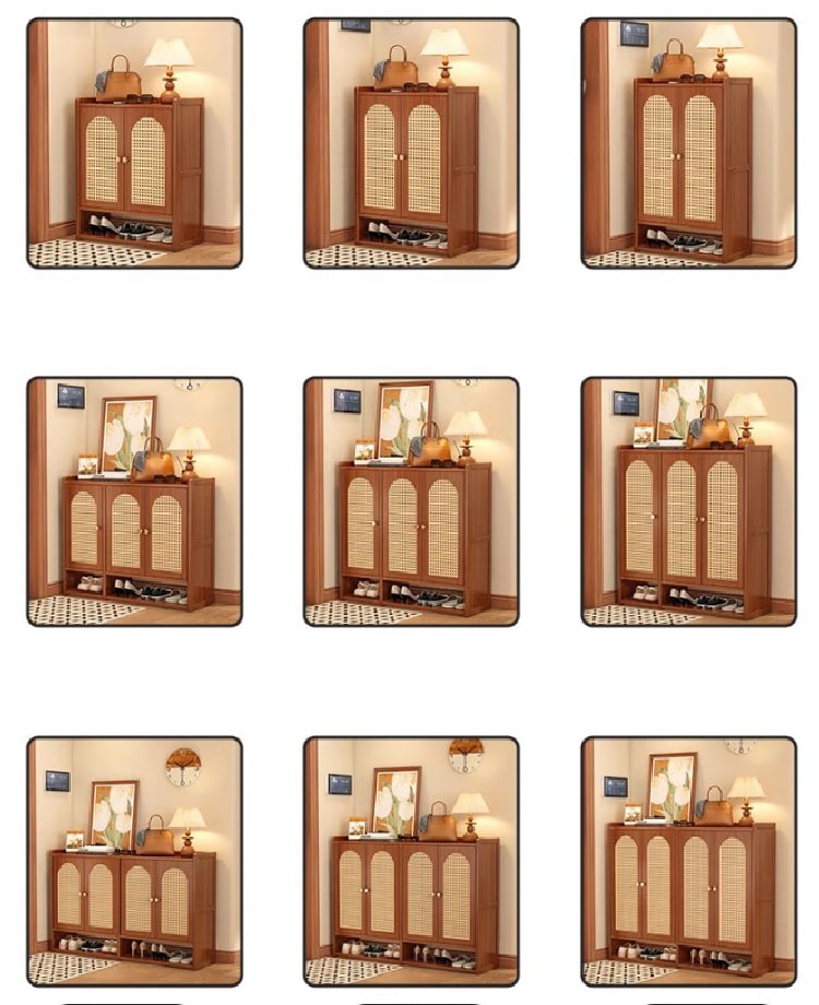 Điểm nổi bật của tủ đựng giày dép này là phần cánh tủ được làm từ mây tự nhiên, đan thủ công tinh xảo. Mây mang lại sự thoáng khí, giúp giày dép bên trong không bị bí mùi, đồng thời tạo nét đẹp gần gũi, sang trọng. Sự kết hợp giữa gỗ sồi và mây tự nhiên mang đến một tổng thể vừa chắc chắn vừa mềm mại, hài hòa.