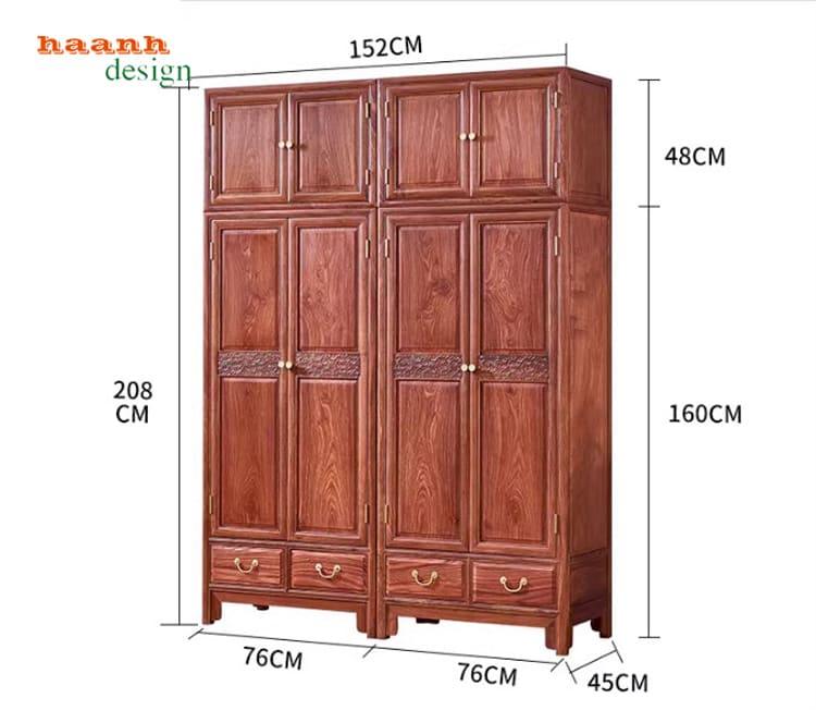 Màu gỗ đỏ trầm kết hợp phong cách giả cổ tạo nên đẳng cấp riêng biệt cho tủ gỗ đựng quần áo.