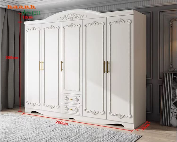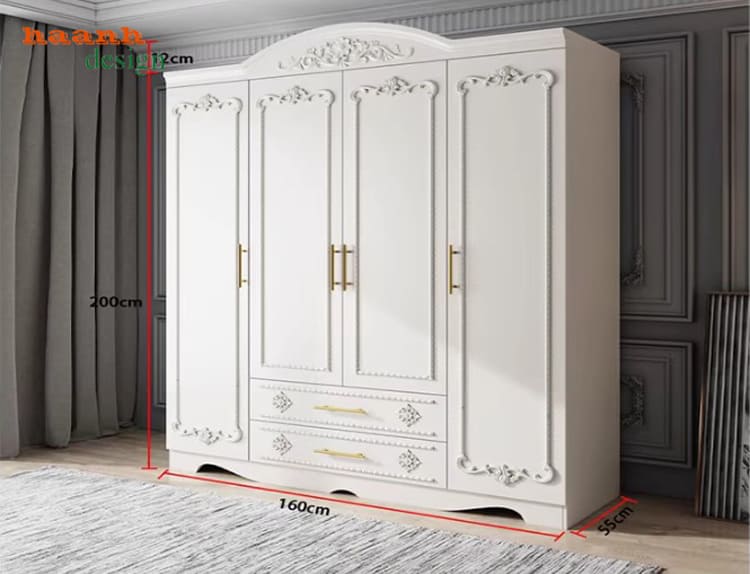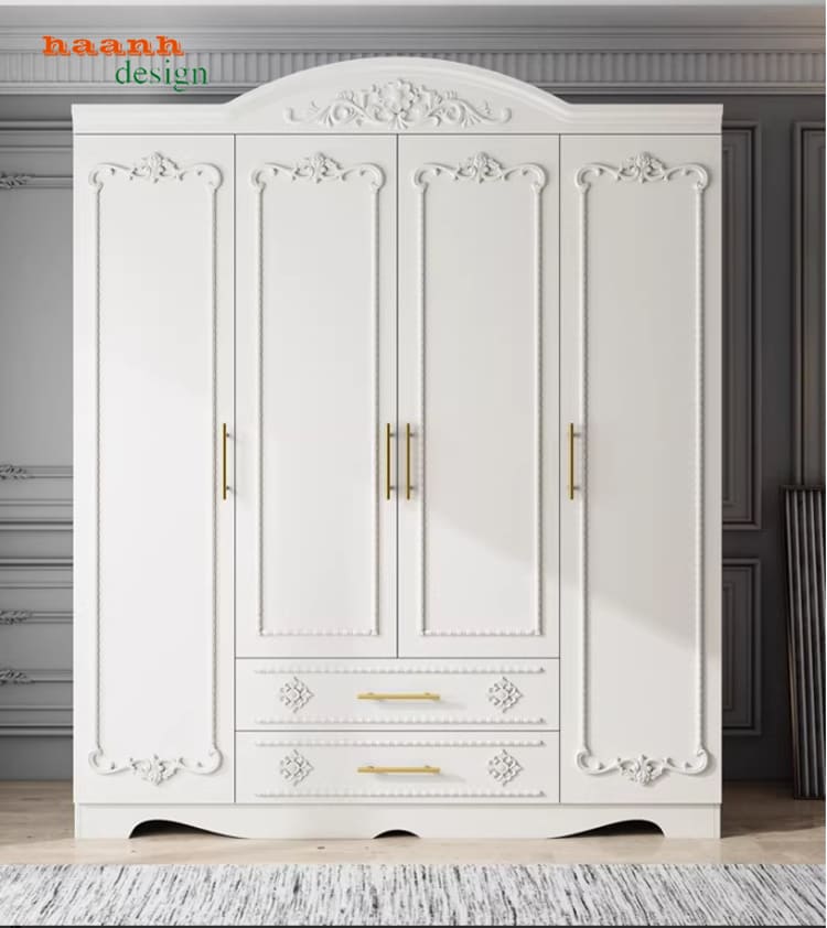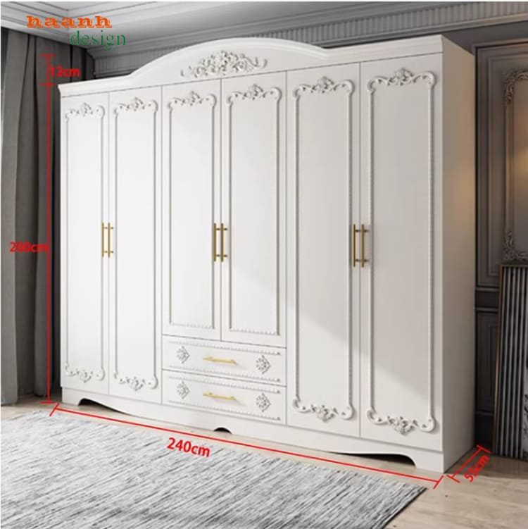 Mẫu tủ áo tân cổ điển thiết kế châu Âu với hoa văn chạm khắc tinh tế.