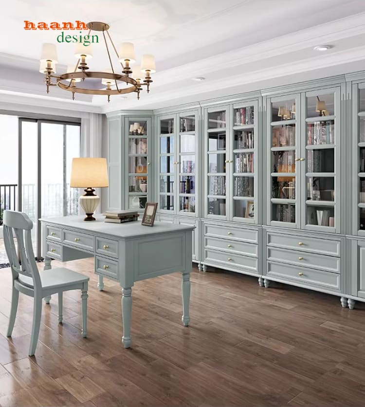 Tủ sách có cửa kính giúp không gian làm việc luôn gọn gàng và sang trọng.