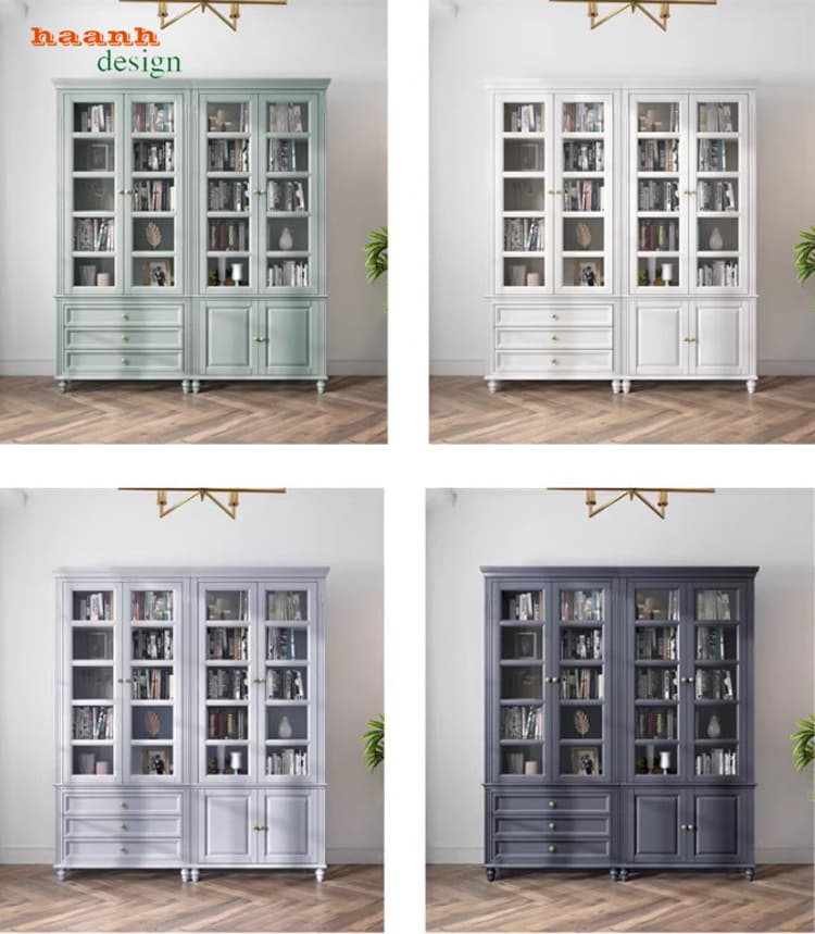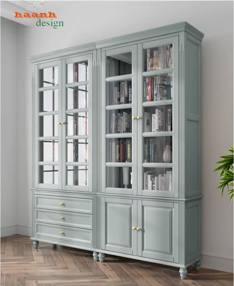 Sự kết hợp giữa tủ sách gỗ, kính và tủ sách gỗ công nghiệp cao cấp mang đến sản phẩm vừa thẩm mỹ vừa tiện dụng.