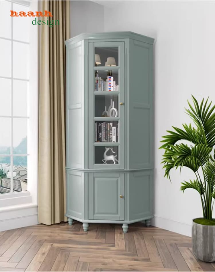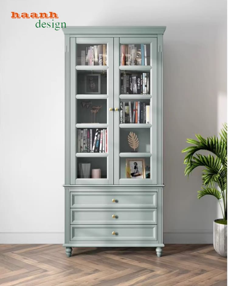 Tủ sách có cửa kính giúp trưng bày sách và đồ decor tinh tế.